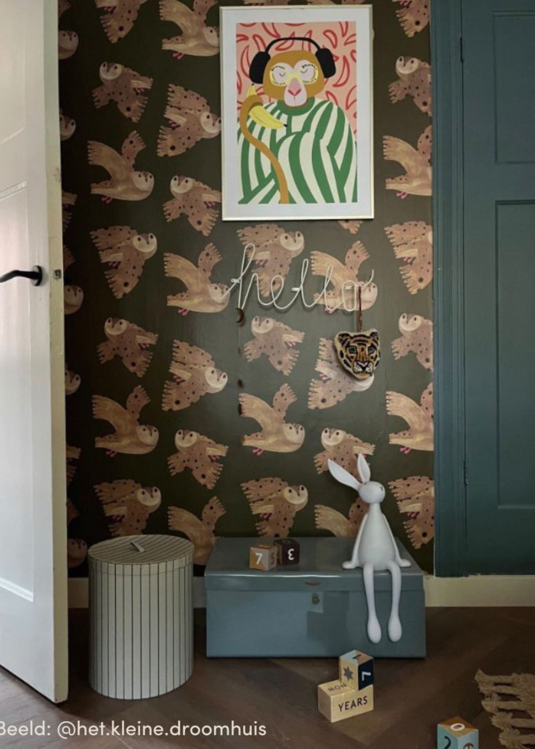 What began as a curious little owl in her sketchbook has grown into a joyful design full of colour, character and mischief. With every brushstroke, Aniek transforms her whimsical creatures into wallpaper friends that spark joy the moment you walk in.