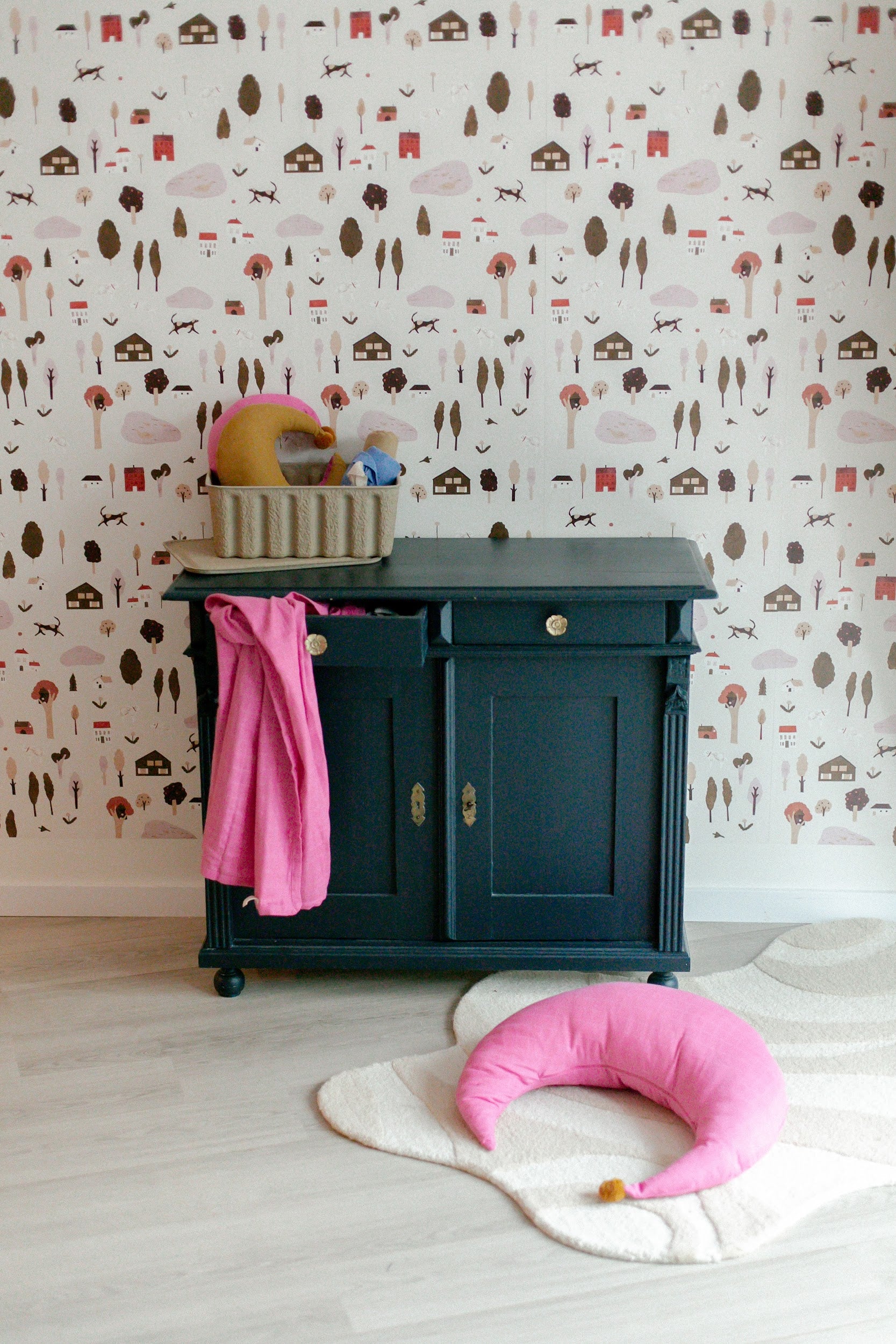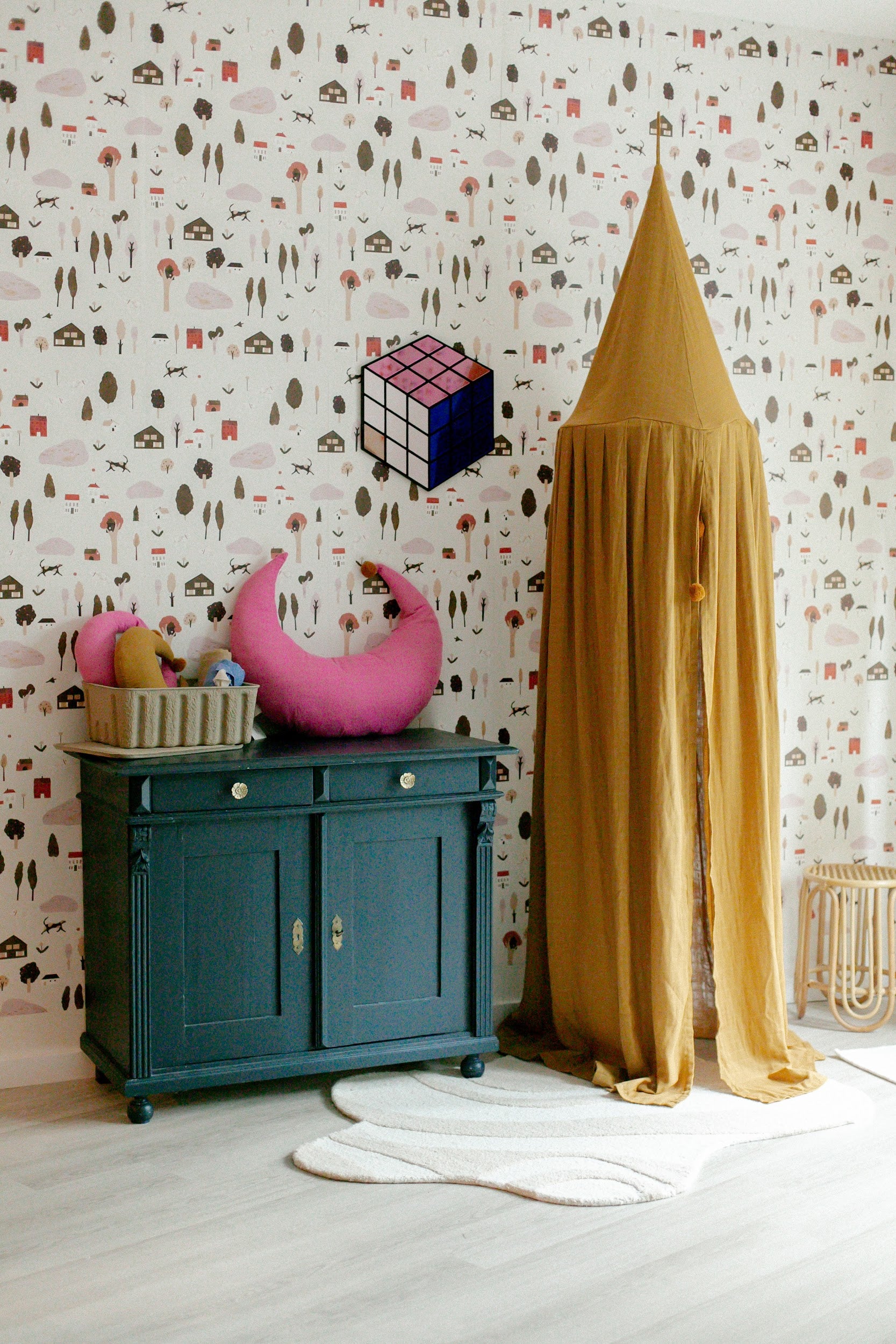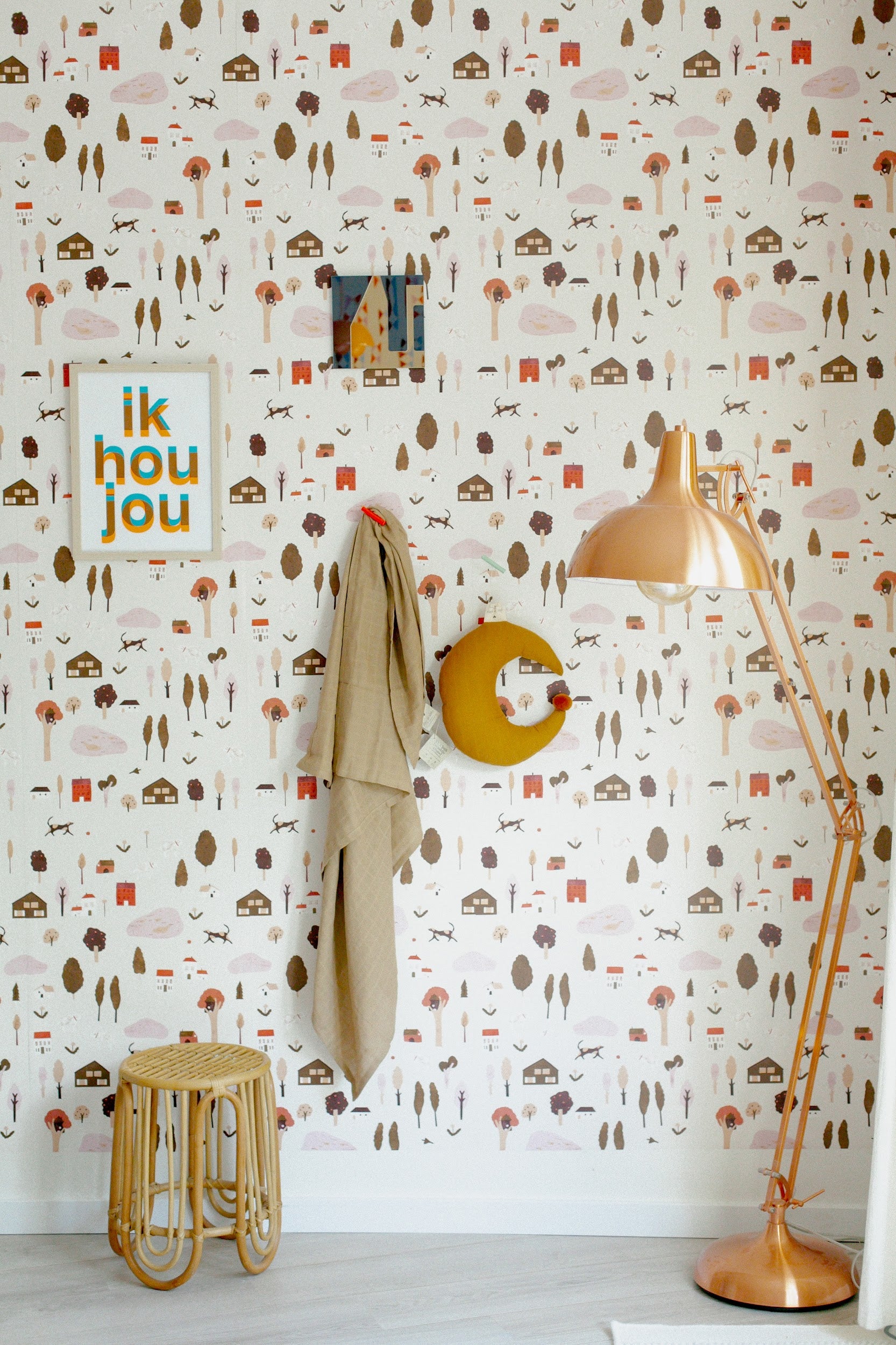 Dies Tapete verfügt über ein detailliertes illustriertes Muster mit Häusern, Bäumen usw animals in sanften Pastelltönen. Entworfen von der Künstlerin Lotte Dirks für Meet Me at the Wall, es ist geeignet für Kinderzimmer, Spielzimmer, bzw Babyzimmer.