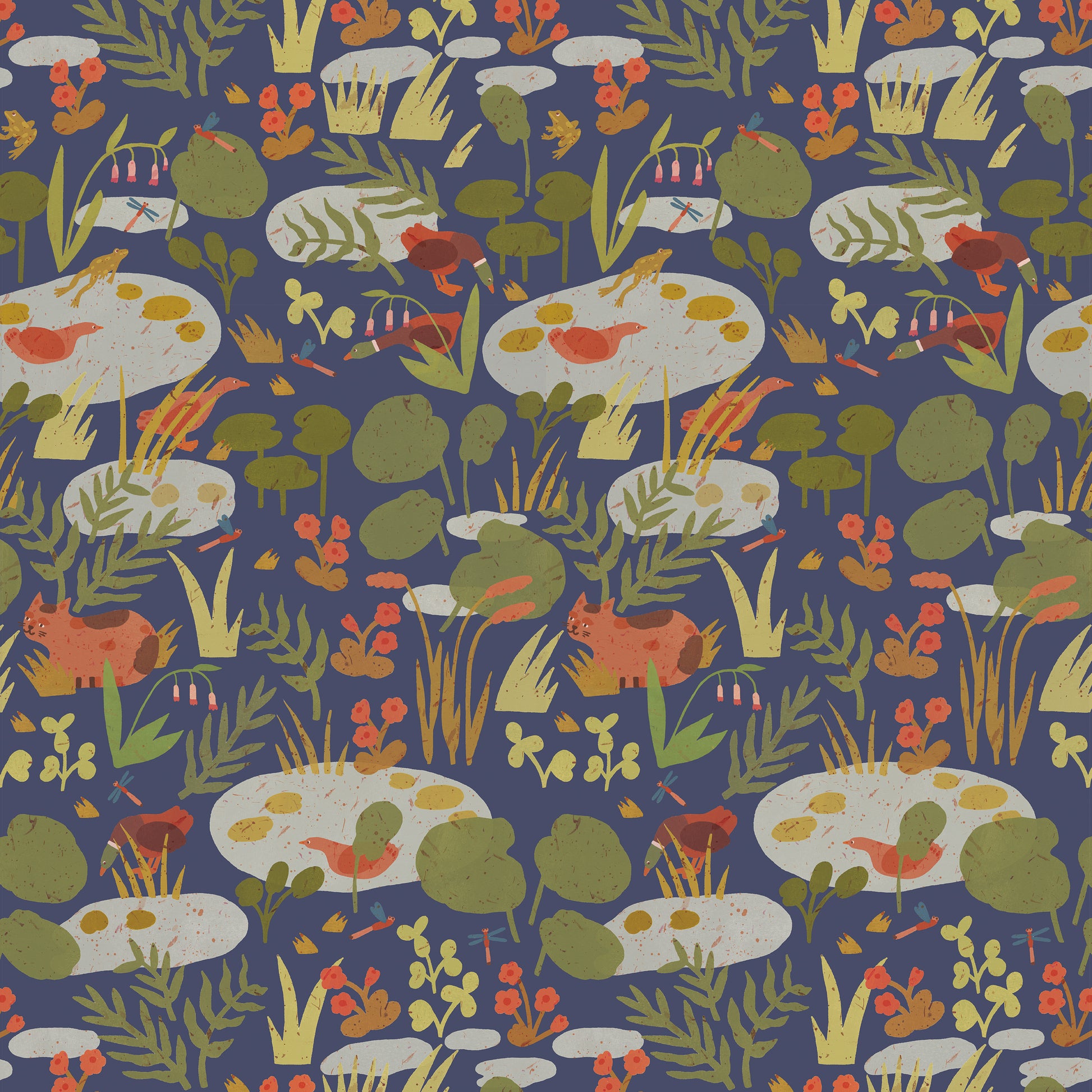 Lily Pond – Midnight is a richly illustrated non-woven children’s wallpaper from the Into the Flowerfields collection by Dutch illustrator Lotte Dirks. Set against a deep midnight blue background, the pattern features a lively pond scene with water lilies, frogs, ducks, playful cats, dragonflies, and lush greenery.