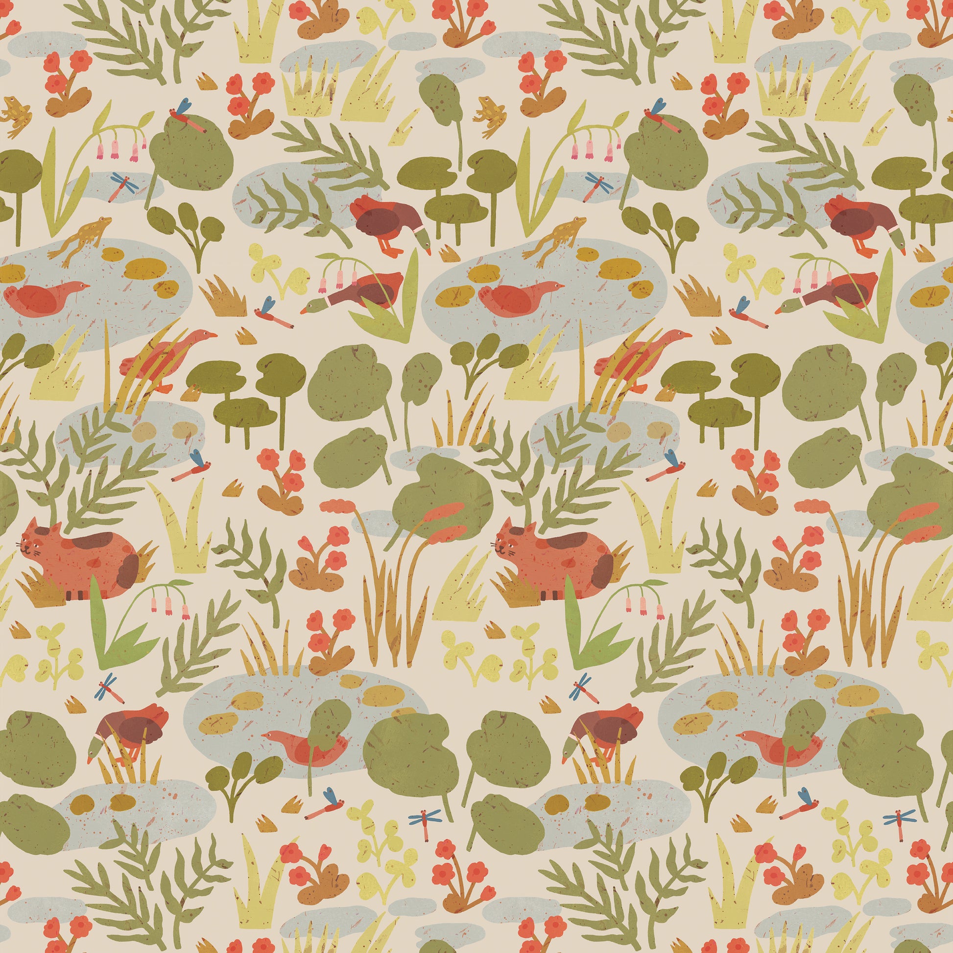 Lily Pond – Oat is a delightful non-woven children’s wallpaper by Lotte Dirks, part of the Into the Flowerfields collection. With a soft oat-colored background, this design brings a peaceful pond scene to life — featuring hand-drawn frogs, lily pads, ducks, cats, dragonflies, plants, and wildflowers in warm earthy tones.