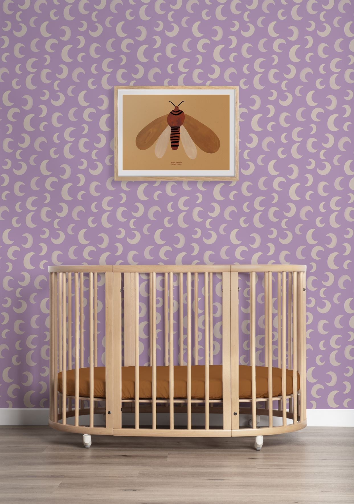 Bring the beauty of nature indoors with the enchanting Moon Spring wallpaper from Meet Me at the Wall, designed by acclaimed illustrator Aniek Bartels. With its soft lilac backdrop and whimsical moon pattern, this wallpaper creates a joyful, dreamy atmosphere perfect for children’s bedrooms, playrooms, and creative spaces. It’s ideal for parents looking to craft a fresh, unique foundation where kids can play, sleep, and imagine.