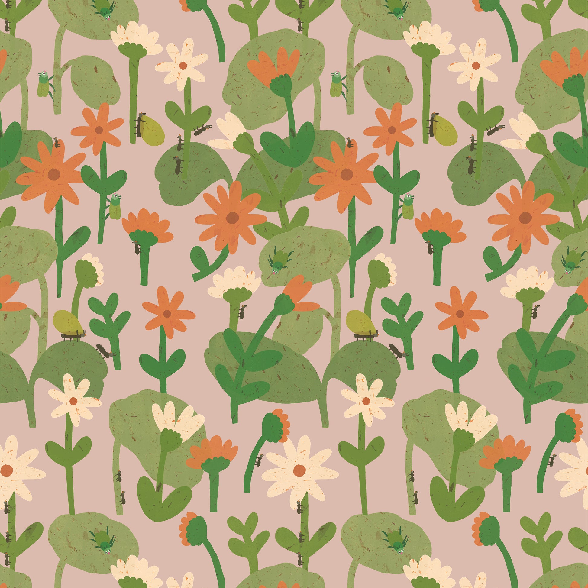 Look closely to find little beetles, ants, caterpillars and snails wandering among the flowers. The muted pink base softens the scene and makes it ideal for a nursery, baby room or any space with a nature-inspired theme.
