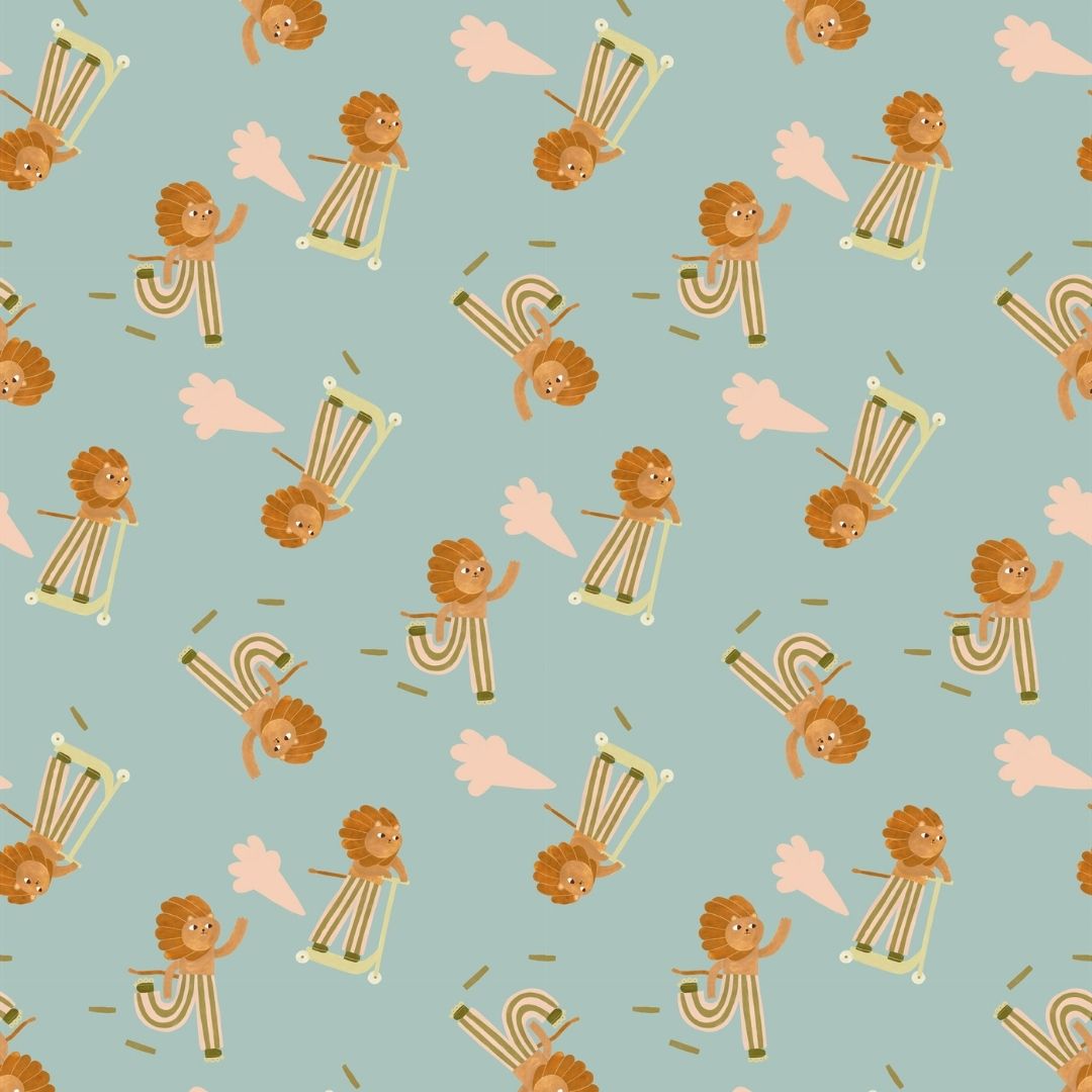 Each element was first hand-painted and then digitally refined, preserving the artwork’s original charm. The fresh sky-blue background creates a bright and airy atmosphere, while the lion’s mint green scooter and green-striped shorts add delightful pops of color. A fun, imaginative design that invites kids to dream, play, and smile.