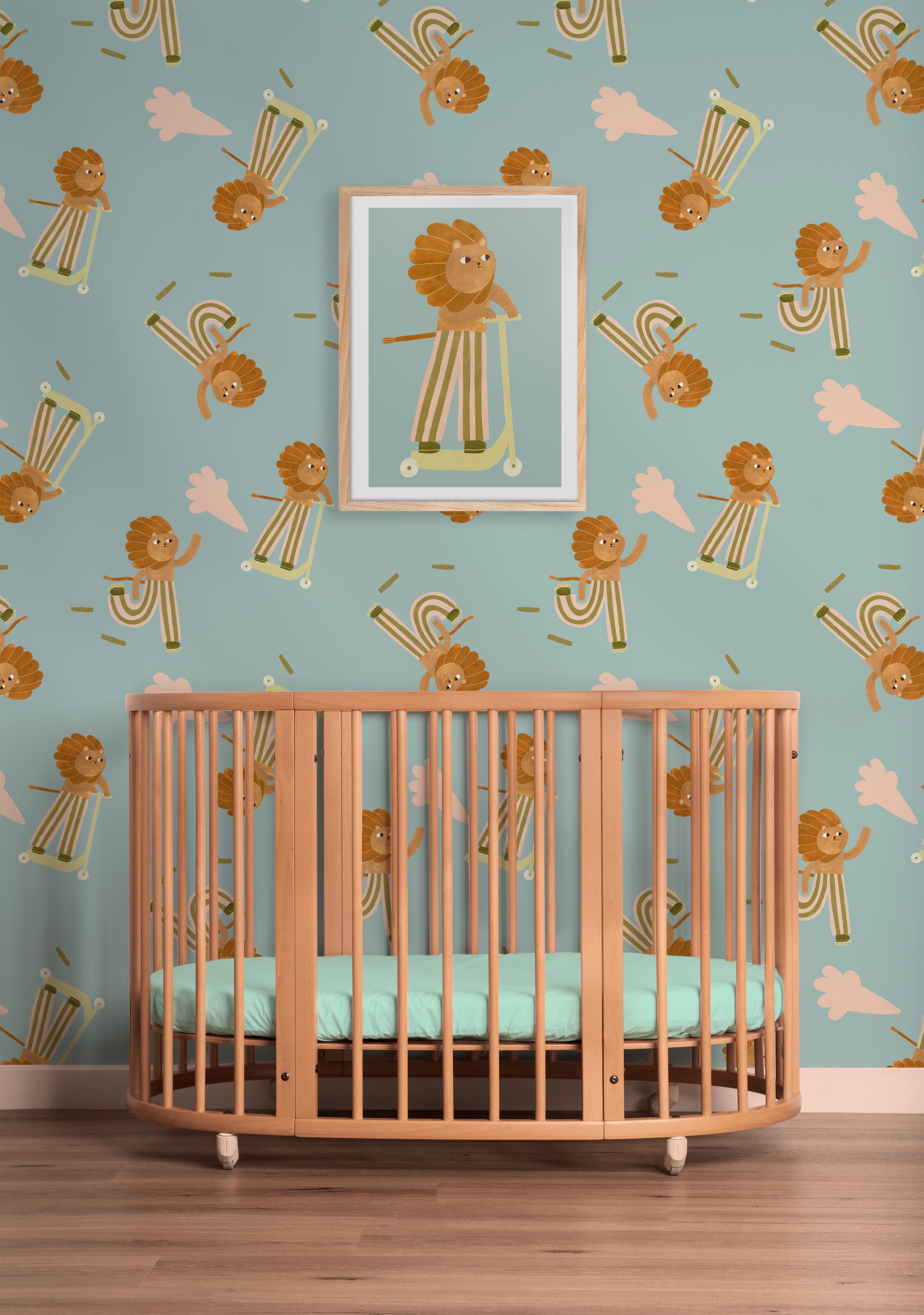Add energy and joy to your child’s space with the Skating Lion Cool Wallpaper from Meet Me at the Wall, designed by Aniek Bartels. Featuring her iconic lion riding a scooter or rolling on skates, this playful animal wallpaper turns any wall into a lively adventure.