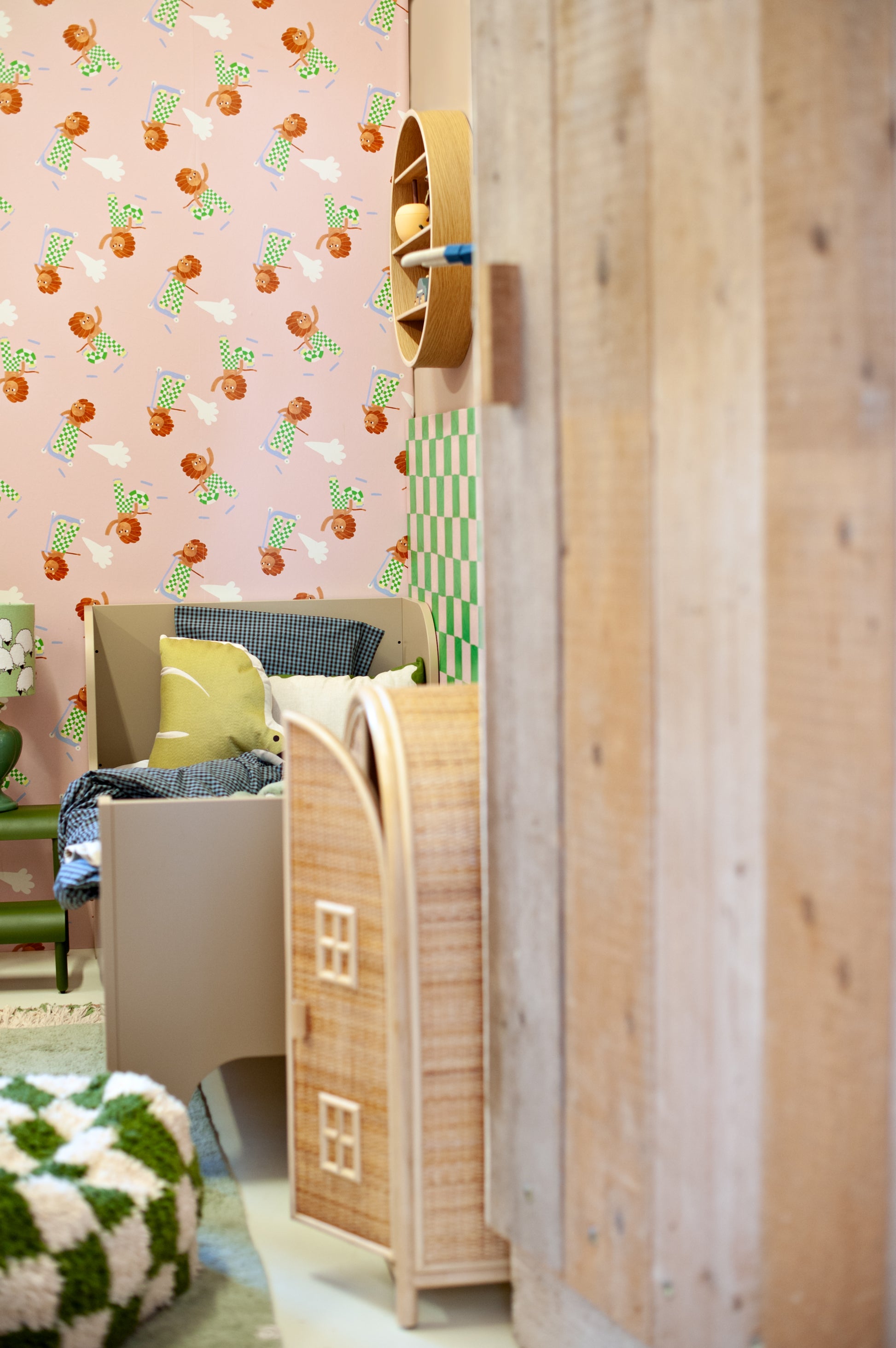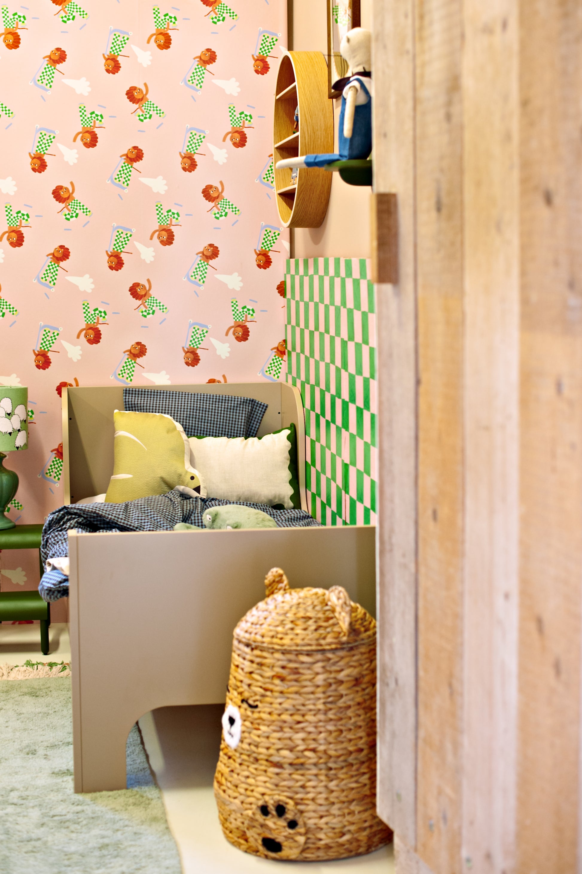 Combine the Skating Lion Green Wallpaper with the green blocks wallpaper from the same collection for a playful, graphic interior. Add wooden furniture and colourful accessories to create a fresh and lively room that’s perfect for playful days and joyful nights.
