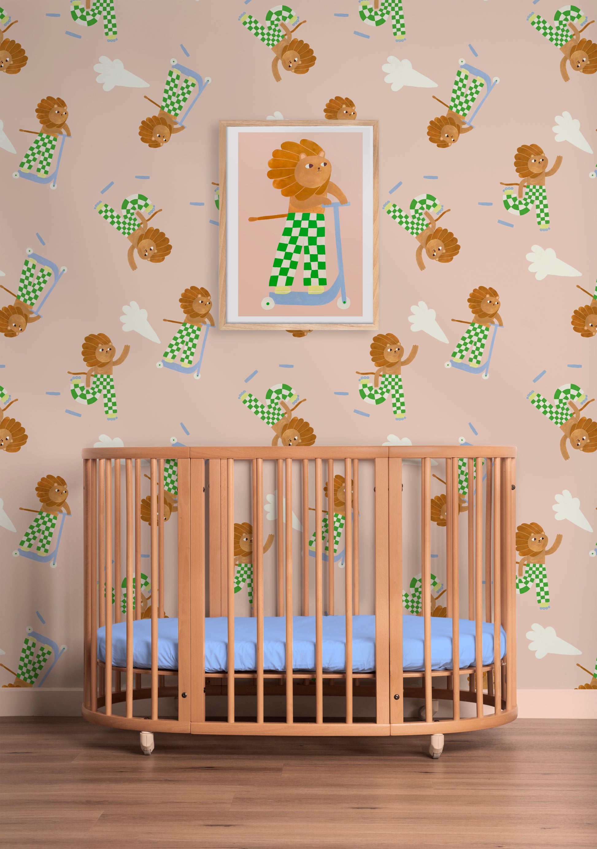 This charming pattern was first hand‑painted by Aniek and then carefully digitized to preserve every brushstroke and expressive detail. Skating Lion is available in four beautiful colour variants, including this version with a soft beige background and green checkered shorts on the lion. The combination of craftsmanship and digital precision makes this wallpaper a true art piece for kids’ interiors.