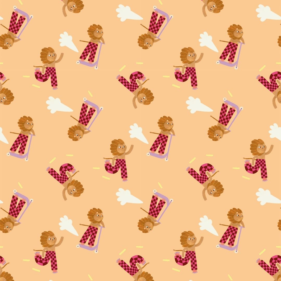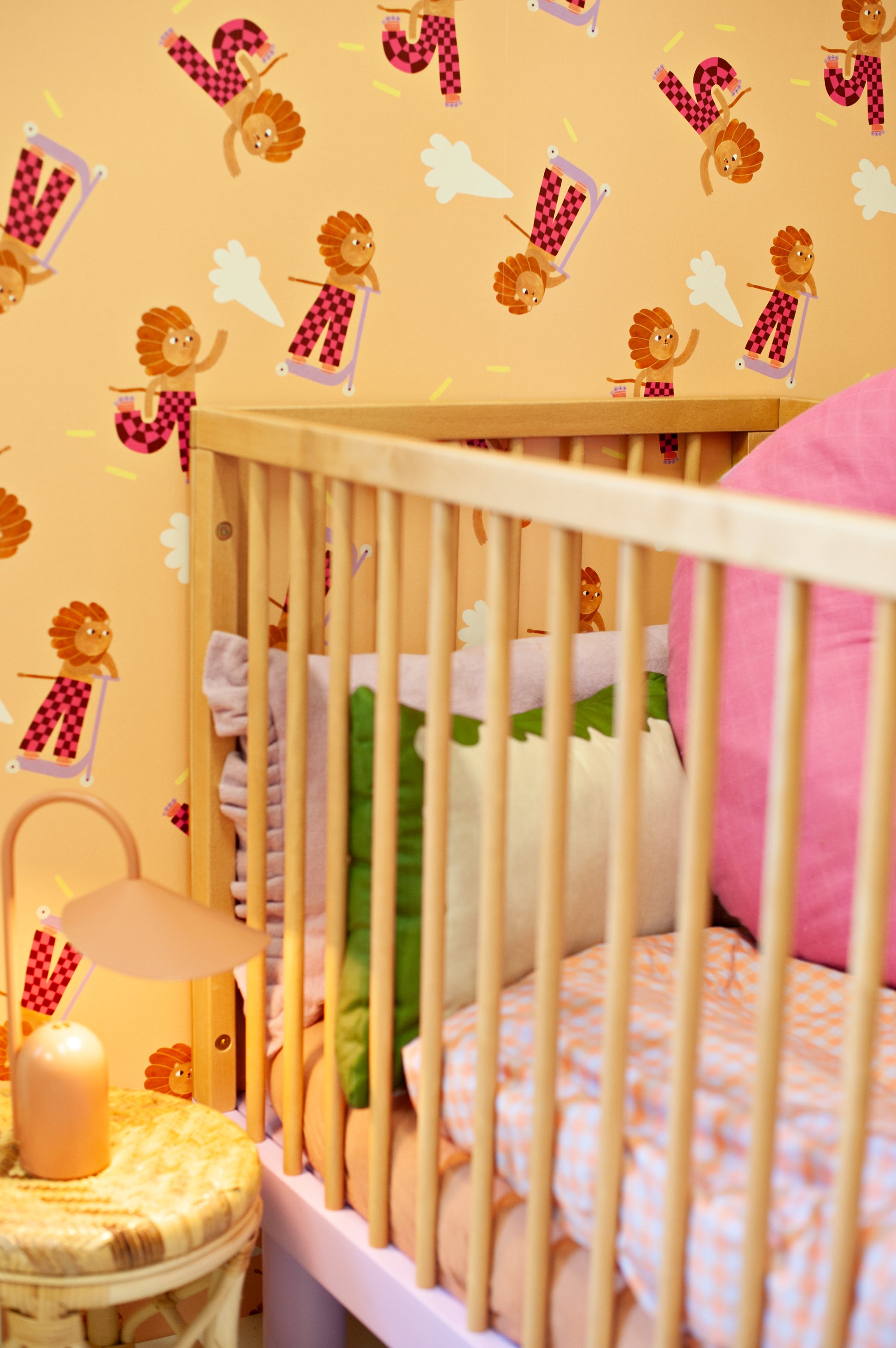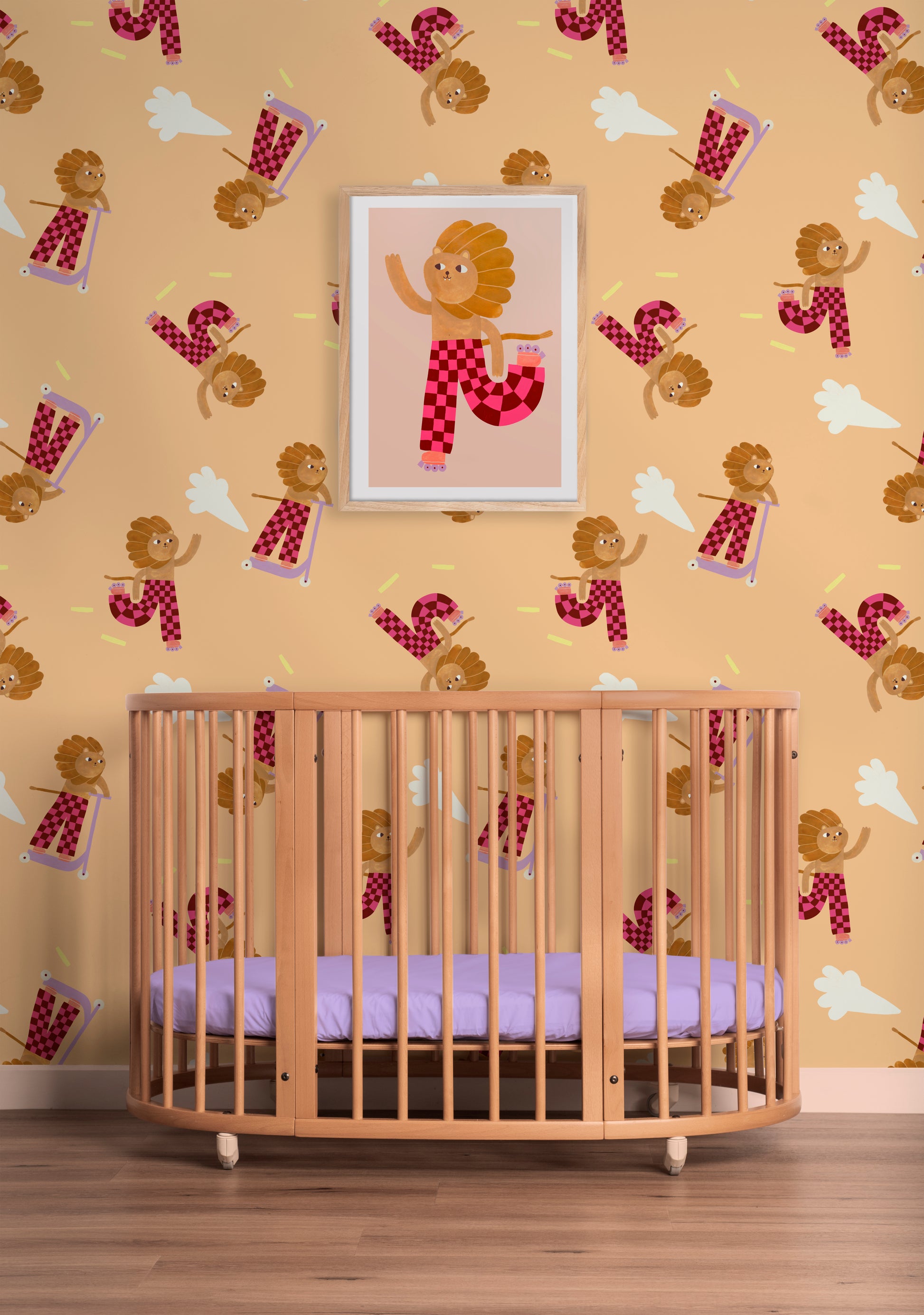 The iconic lion from Aniek Bartels shines in a delightful new colorway with the Skating Lion Sweet Wallpaper from Meet Me at the Wall. Sometimes on his scooter, sometimes on roller skates, and always full of energy — this playful lion brings movement and joy to any child’s room.