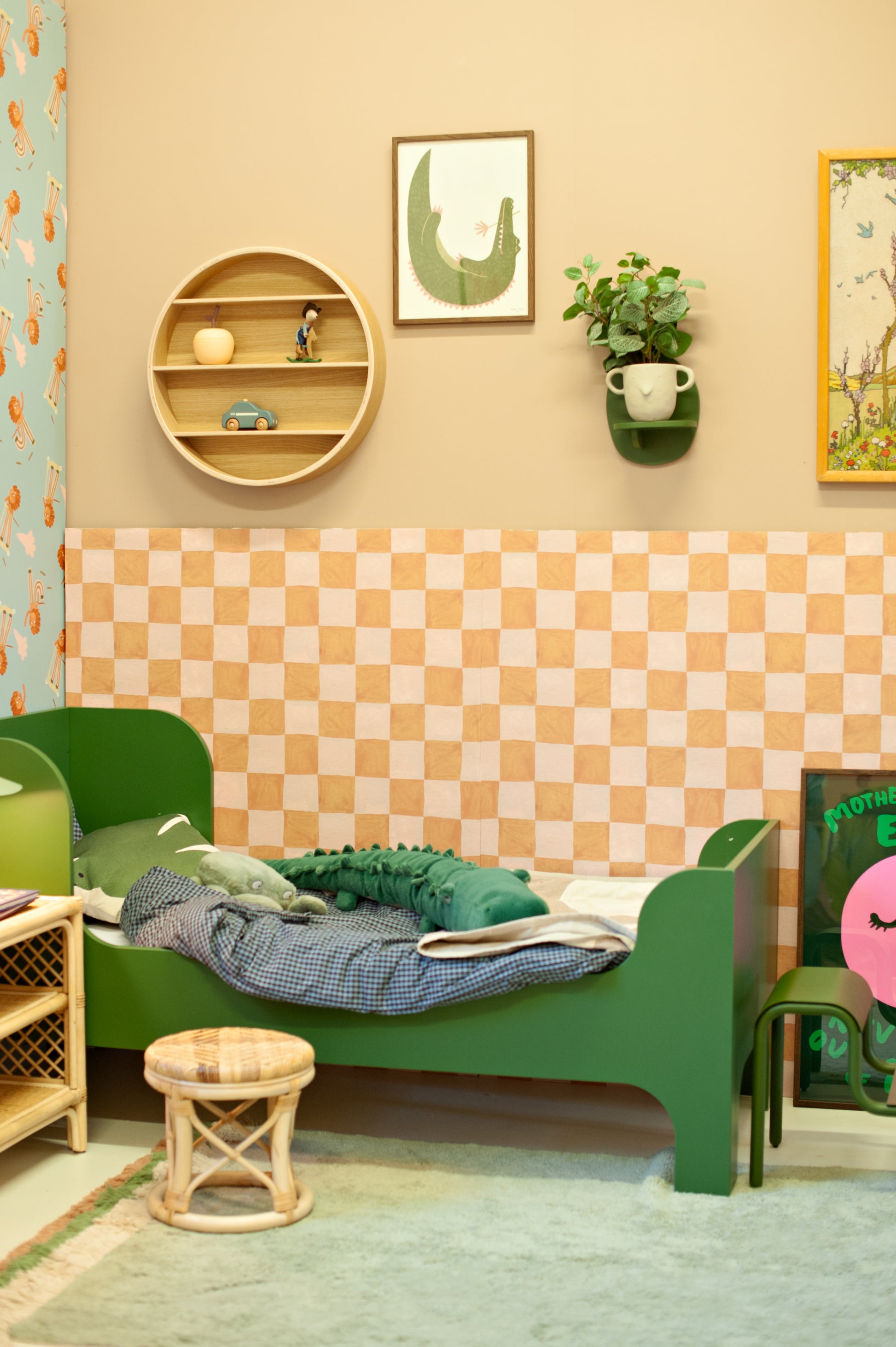 Choose Square Blocks Sand for a soft but playful foundation in a kids’ room, creative hallway, or even a stylish powder room. Pair it with natural materials like wood or rattan for a warm aesthetic, and pull colors from the blocks into your accessories for cohesion. Want more playfulness? Add contrast by styling it with the green tones of Skating Lion Cool.