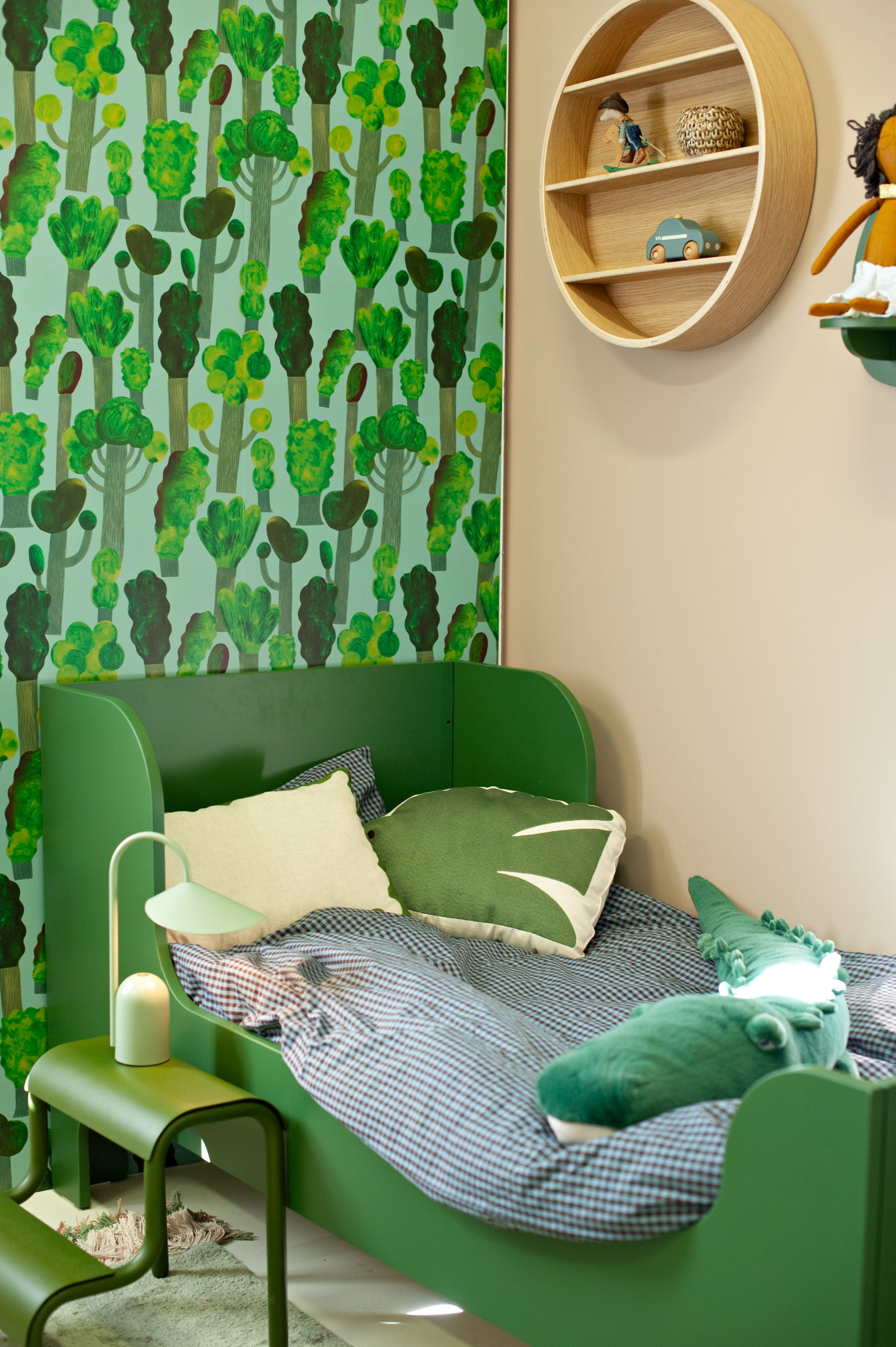 Pair Trees Wallpaper with natural materials like wood, wool, or linen to create a calming foundation. Choose accents such as cushions or art in green and blue tones to echo the colors in the design. Consider using it as a feature wall, wainscoting, or accent wall in hallways or bathrooms for a surprising and refined effect.