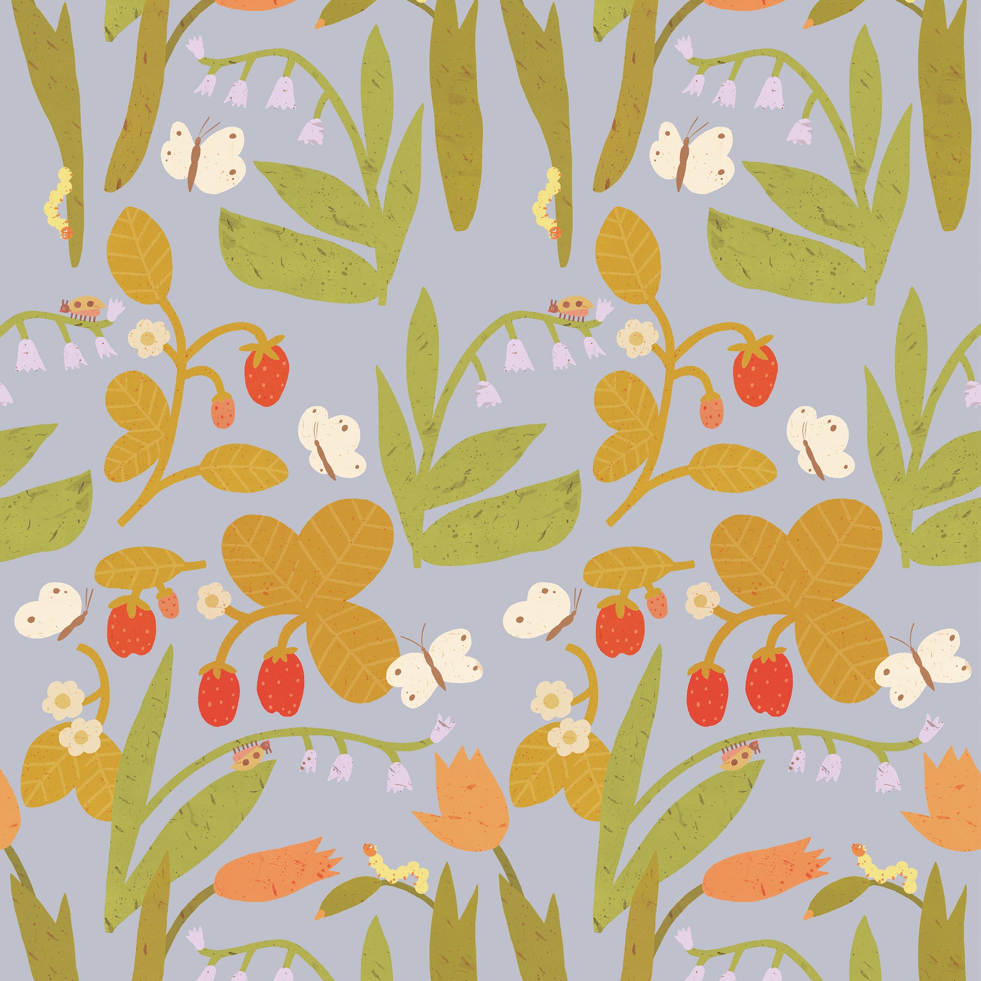 Strawberry Field – Grey Lavender is a soft and serene non-woven children’s wallpaper from the Into the Flowerfields collection by Lotte Dirks. This design features a calming grey lavender backdrop, filled with delicate hand-drawn elements like strawberries, butterflies, flowers, caterpillars, and foliage — making it perfect for peaceful and playful kids’ interiors.