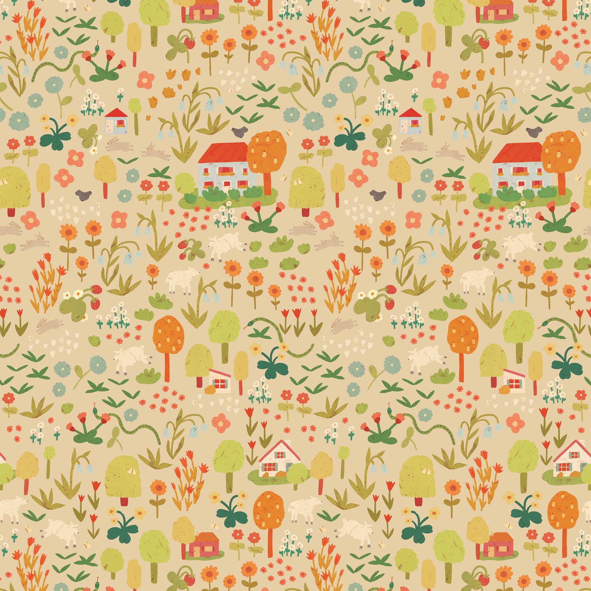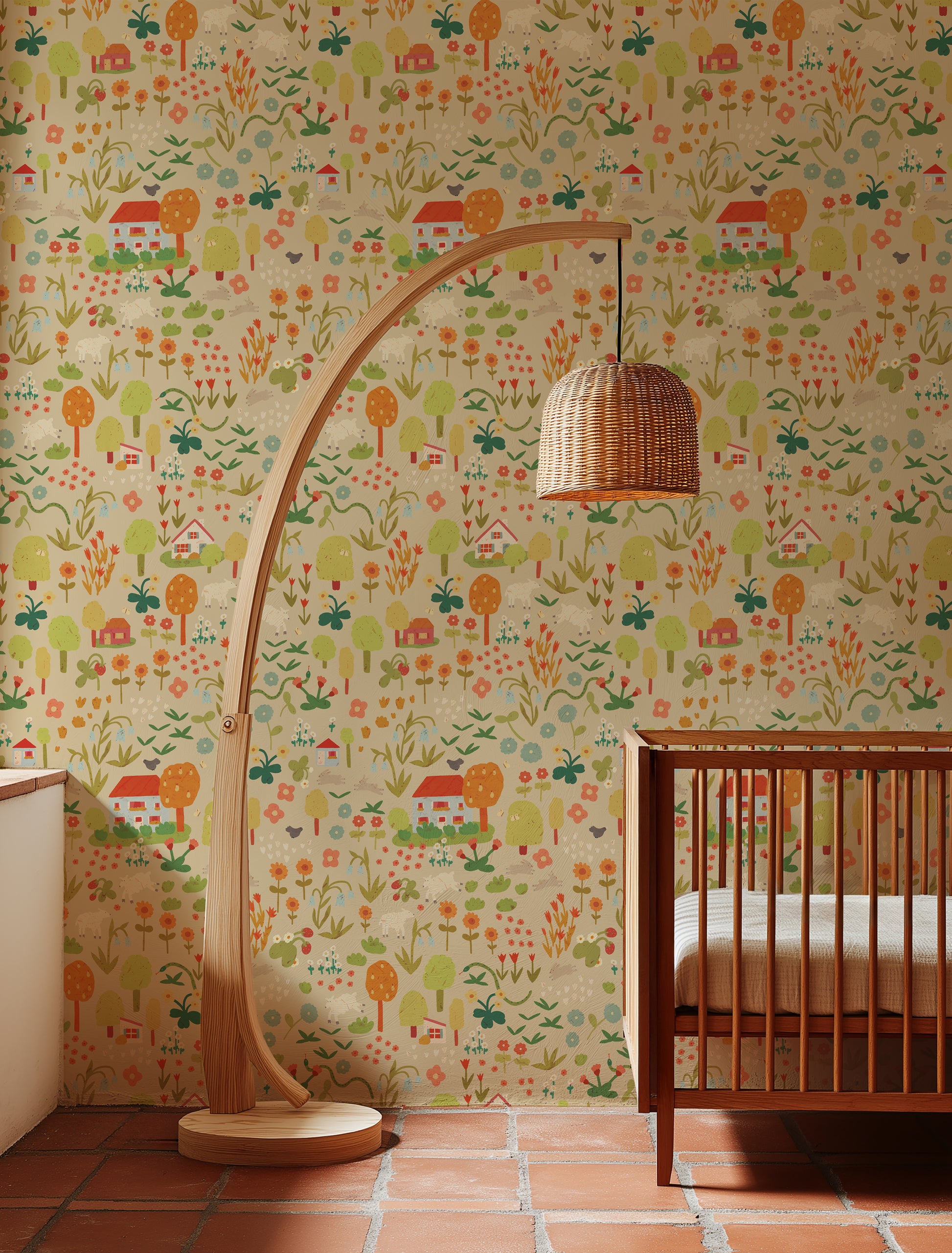 Perfect for nurseries, children’s rooms, or playrooms, this wallpaper isn’t just decorative — it’s interactive. Children will enjoy discovering the many hidden elements within the design, including tiny cottages, fluffy bunnies, sheep, trees, and blooming flowers. It’s both a creative stimulus and a language-learning tool!